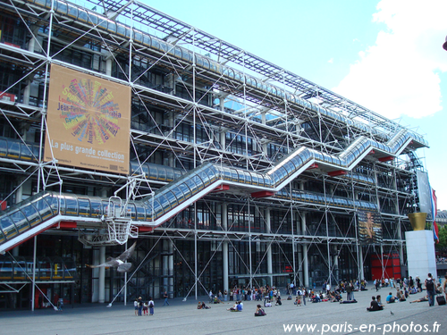 Aujourd’hui, je vous propose à nouveau un bâtiment archi-connu : le Centre Georges Pompidou (ou Centre Beaubourg) qui abrite une bibliothèque et un musée. Les tuyaux qu’on voit à l’extérieur sont des escalators d’accès aux différents niveaux du bâtiment. L’entrée du Musée d’art moderne est par ex. tout en haut.